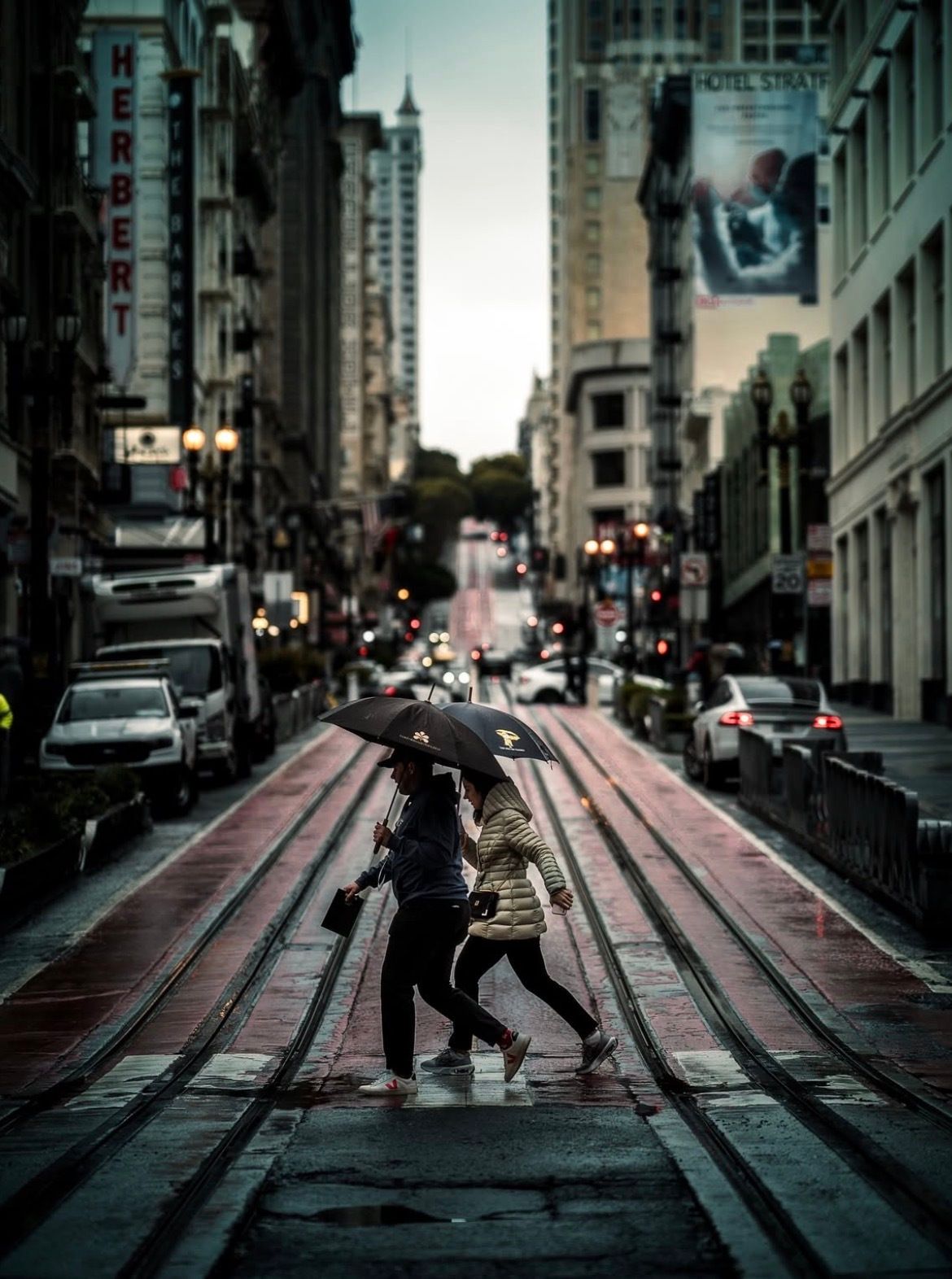 As touched on before, catching the couple mid-stride makes the photo feel alive and energetic. Also —> having the woman in that slightly hunched position gives a nice storytelling touch too —> she is probably jumping a little to avoid the puddles on the ground.